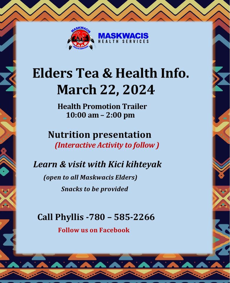 Elders Tea & Health Info Session Mar 8, 2024 | Maskwacis Public Health March 22, 2024 from 10am – 2pm At the Health Promotion Trailers!!